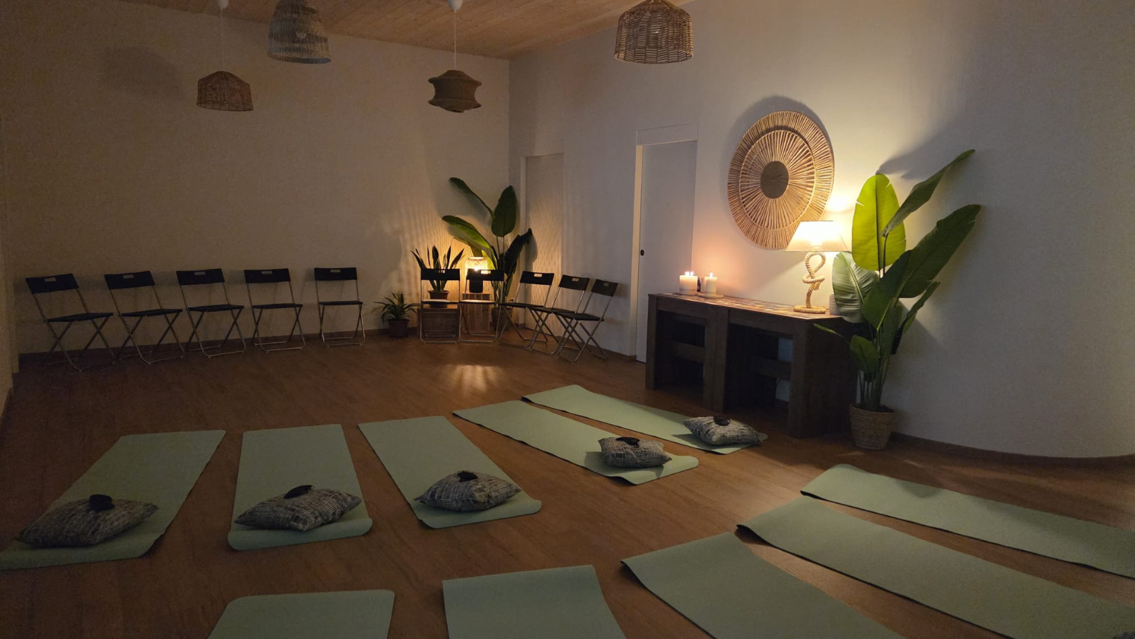 La sala è uno spazio di 40 mq. dotata di aria condizionata, con pavimento e soffitto in legno, grande armadio a muro con tappetini yoga, cuscini e coperte a disposizione. Può ospitare comodamente fino a 10 tappetini stesi a terra. Impianto audio SONOS e luci regolabili (calde/fredde, soffuse/intense).