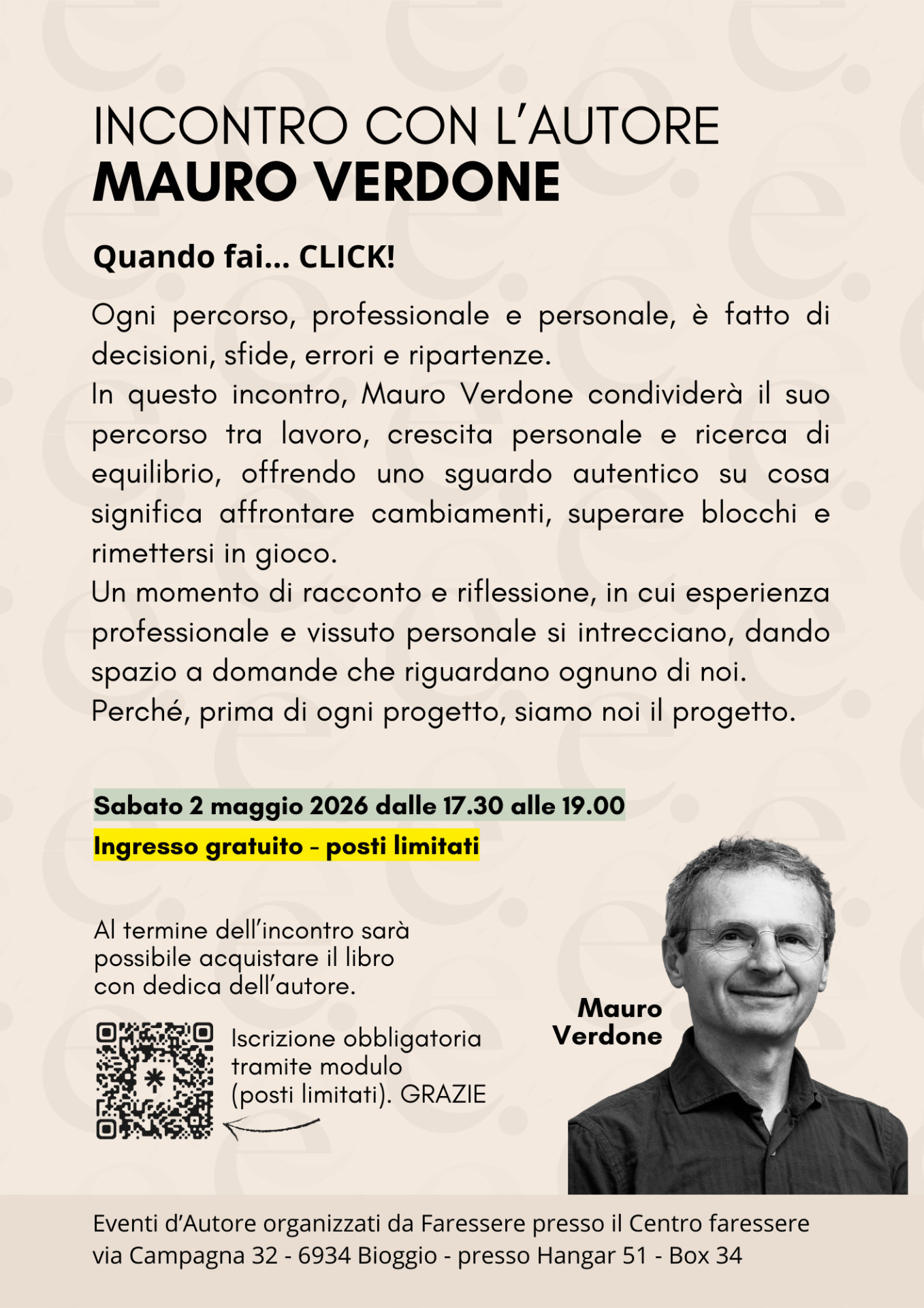 L'incontro si inserisce nel ciclo degli Eventi d'Autore organizzati dal Centro Faressere: momenti pensati per creare spazi di ascolto, confronto e ispirazione, in cui le storie diventano strumenti per leggere anche il proprio percorso.