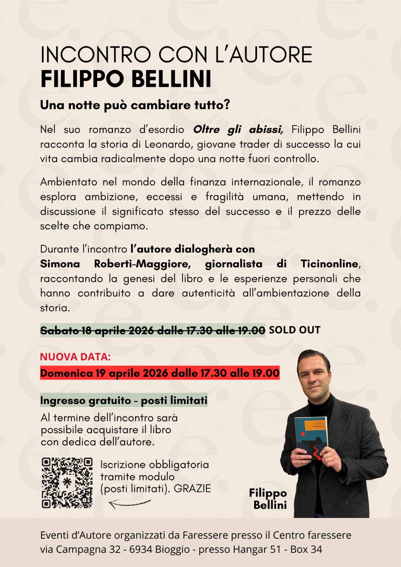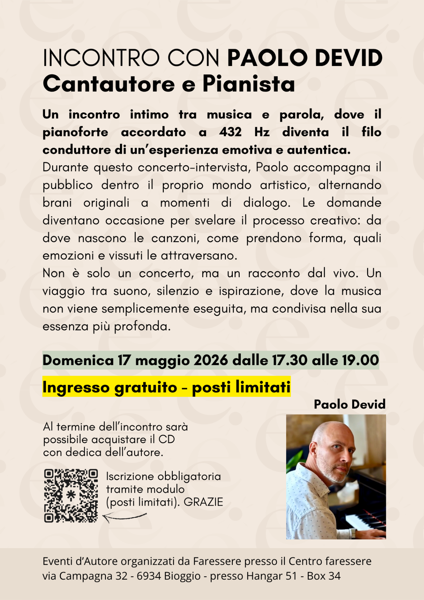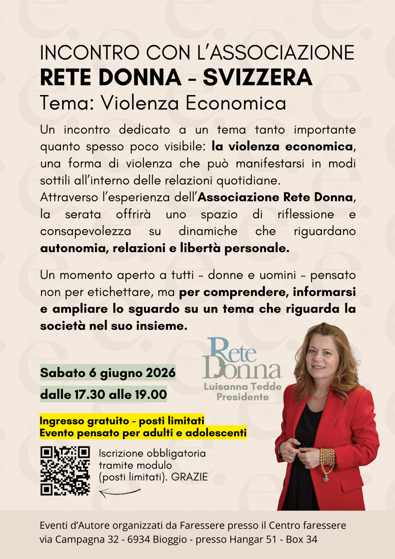 L'evento si inserisce nel ciclo degli Eventi d'Autore organizzati da Faressere, momenti di approfondimento e confronto pensati per portare nel territorio testimonianze significative e stimolare riflessioni su tematiche sociali, culturali e umane.