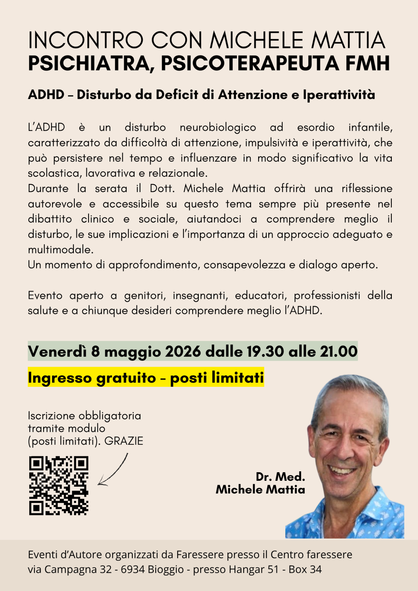 L'incontro con il Dr. Med. Michele Mattia sarà un'occasione per avvicinarsi all'ADHD in modo serio, accessibile e senza semplificazioni, aprendo uno spazio di comprensione e riflessione su un tema che riguarda sempre più persone, a tutte le età.