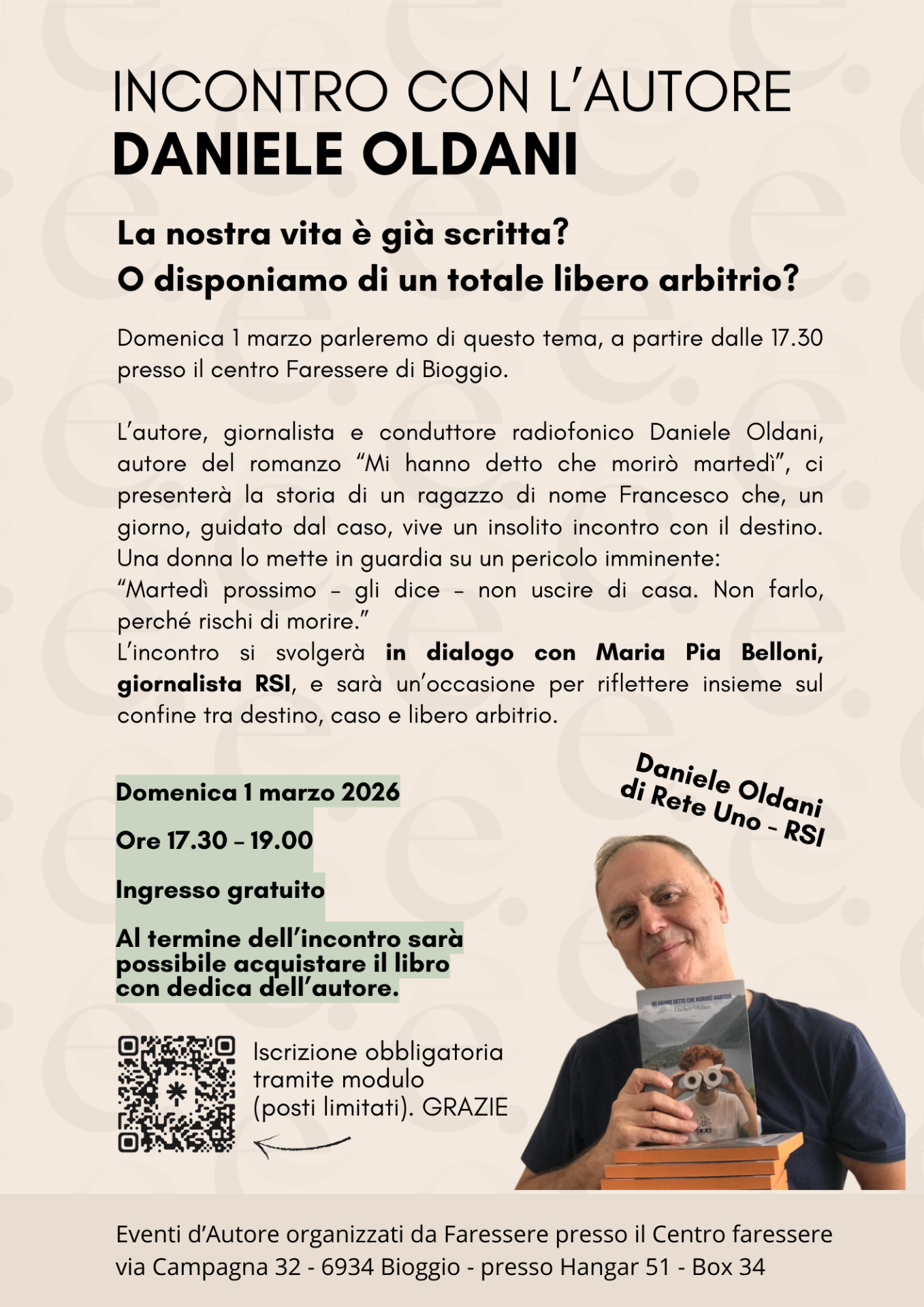 A partire dal romanzo "Mi hanno detto che morirò martedì", Daniele Oldani ci accompagnerà in una riflessione profonda e accessibile su quanto la nostra vita sia già scritta e quanto spazio resti alle nostre scelte. Un dialogo con Maria Pia Belloni, giornalista RSI, tra narrazione, esperienza e domande universali, in un clima intimo e di ascolto.