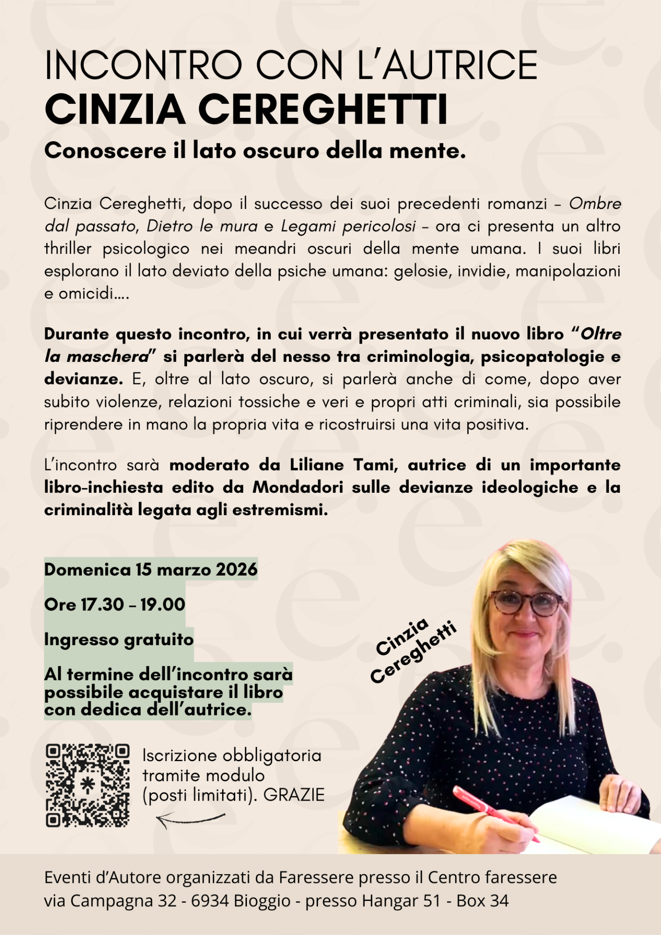 Durante l'incontro, Cinzia Cereghetti presenterà il suo nuovo thriller psicologico "Oltre la maschera", esplorando temi come manipolazione, devianza, gelosia, relazioni tossiche e violenza.
