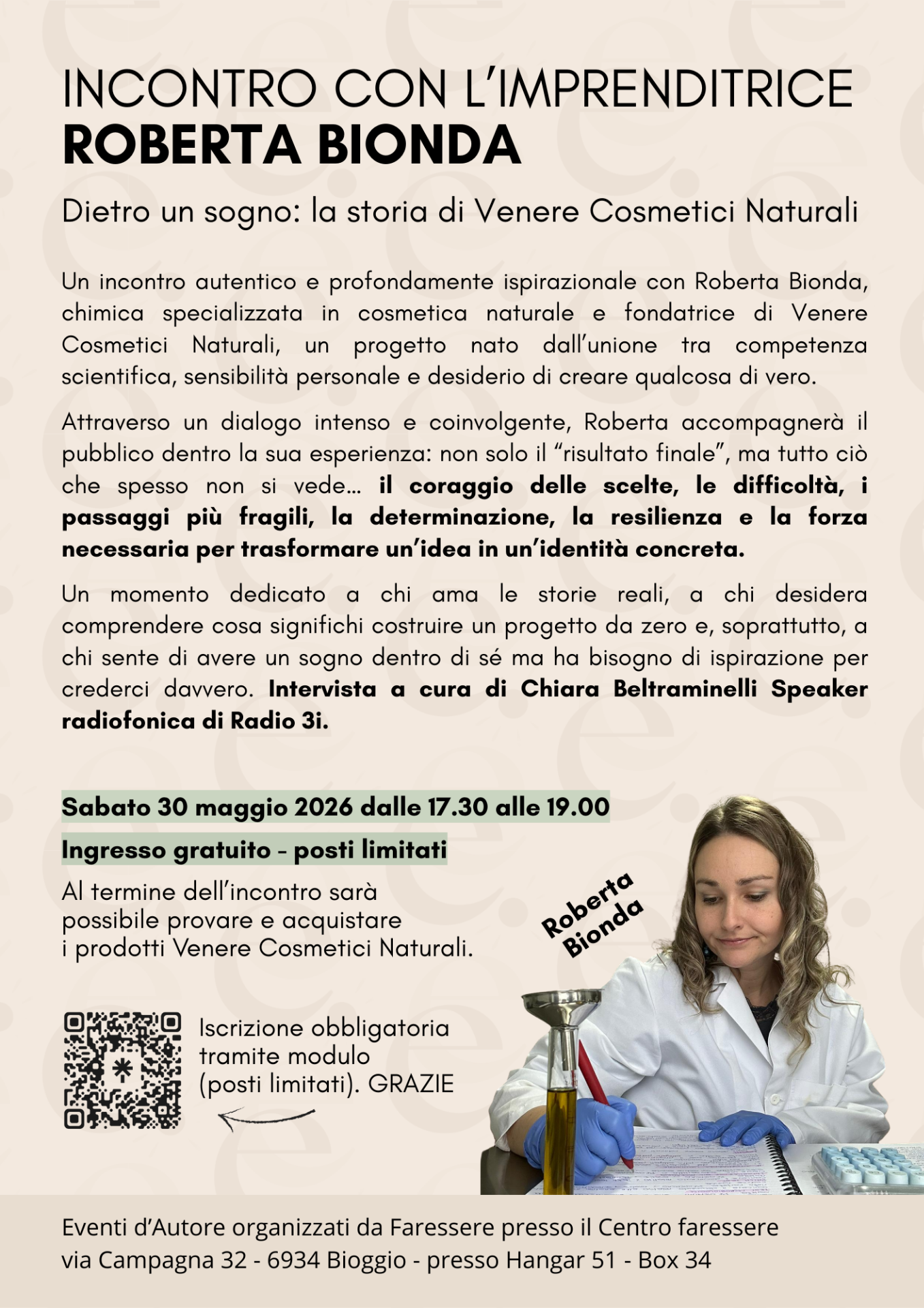 Attraverso un dialogo autentico e coinvolgente, Roberta racconterà il suo percorso personale e professionale: il desiderio di creare qualcosa di proprio, la nascita del progetto Venere, le difficoltà incontrate lungo il cammino e la determinazione necessaria per continuare a crederci anche nei momenti più complessi.